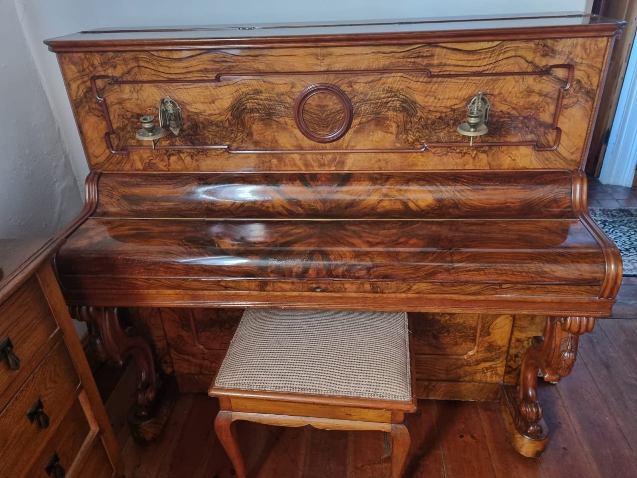 This beautiful antique, made in circa 1890, has been well preserved. The rare burr walnut cabinet, with ornate legs will make a beautiful focal point in any venue. This piano has original parts, confirming the far below average wear and tear. The piano is mechanical sound, with a beautiful tone, considering the age. Ideal for a stately home with antiques or even a guest house.